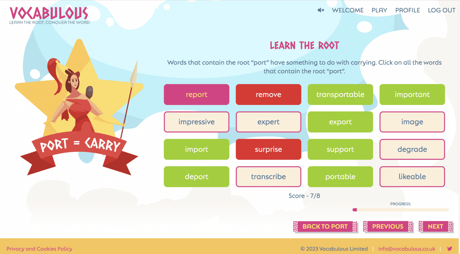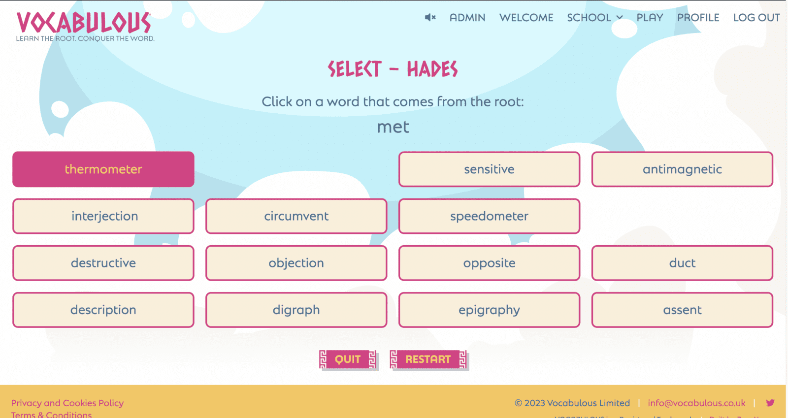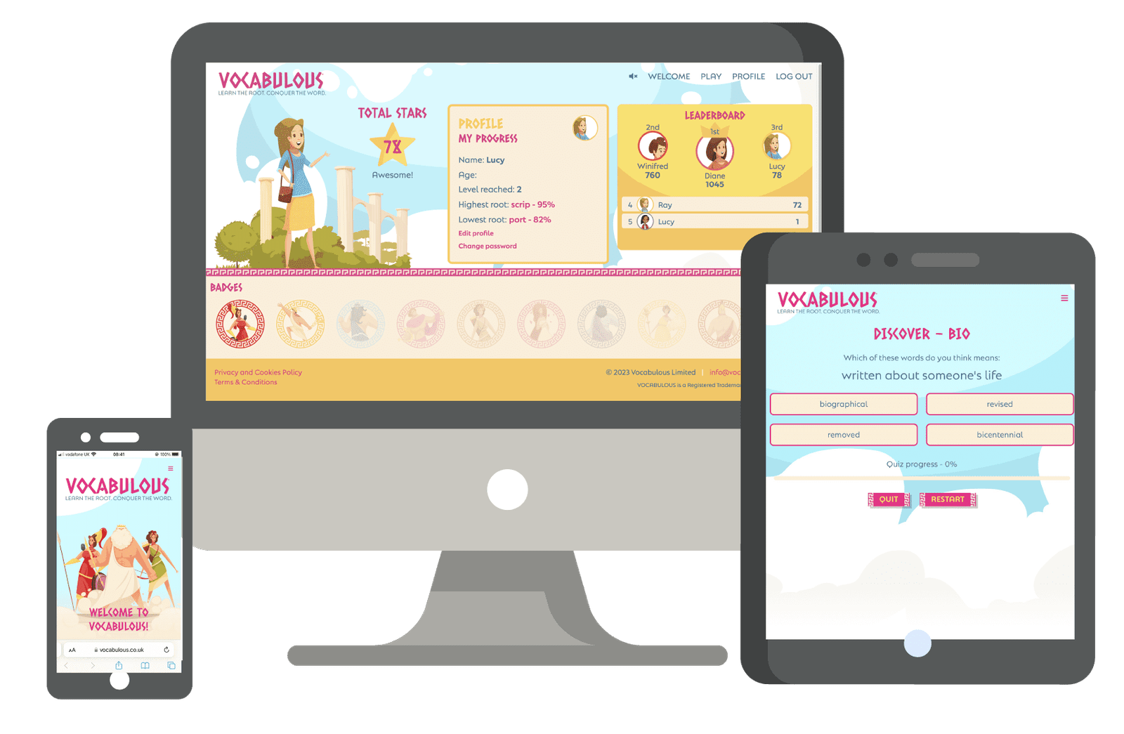 Vocabulous uses Latin and Greek root words to teach word patterns. Students then use these patterns to work out the meaning of unknown words which share the same root.