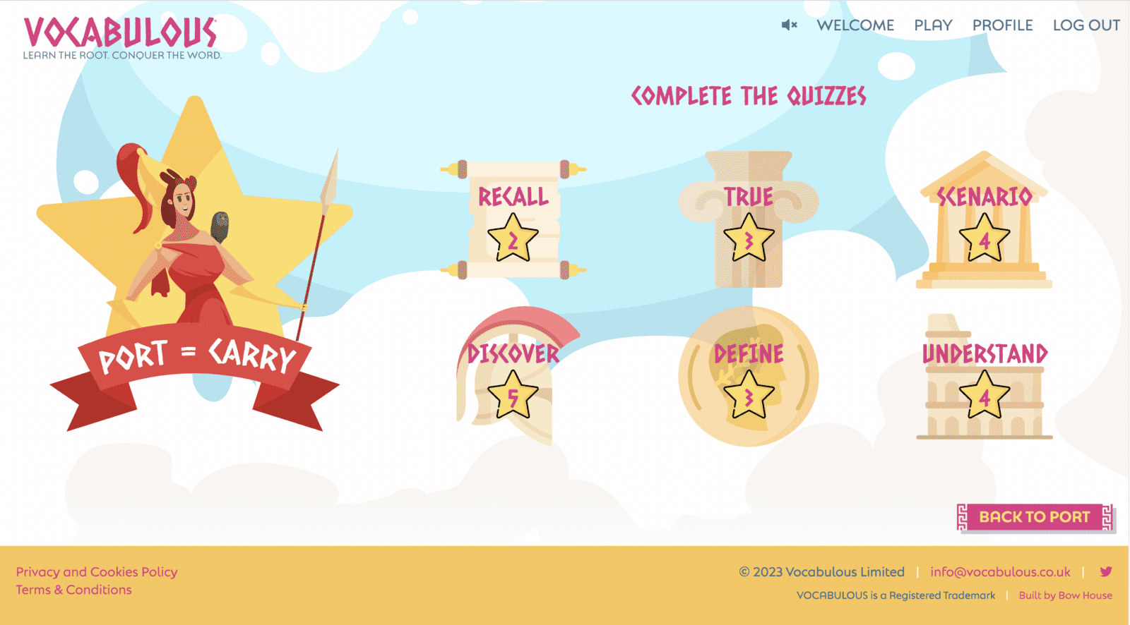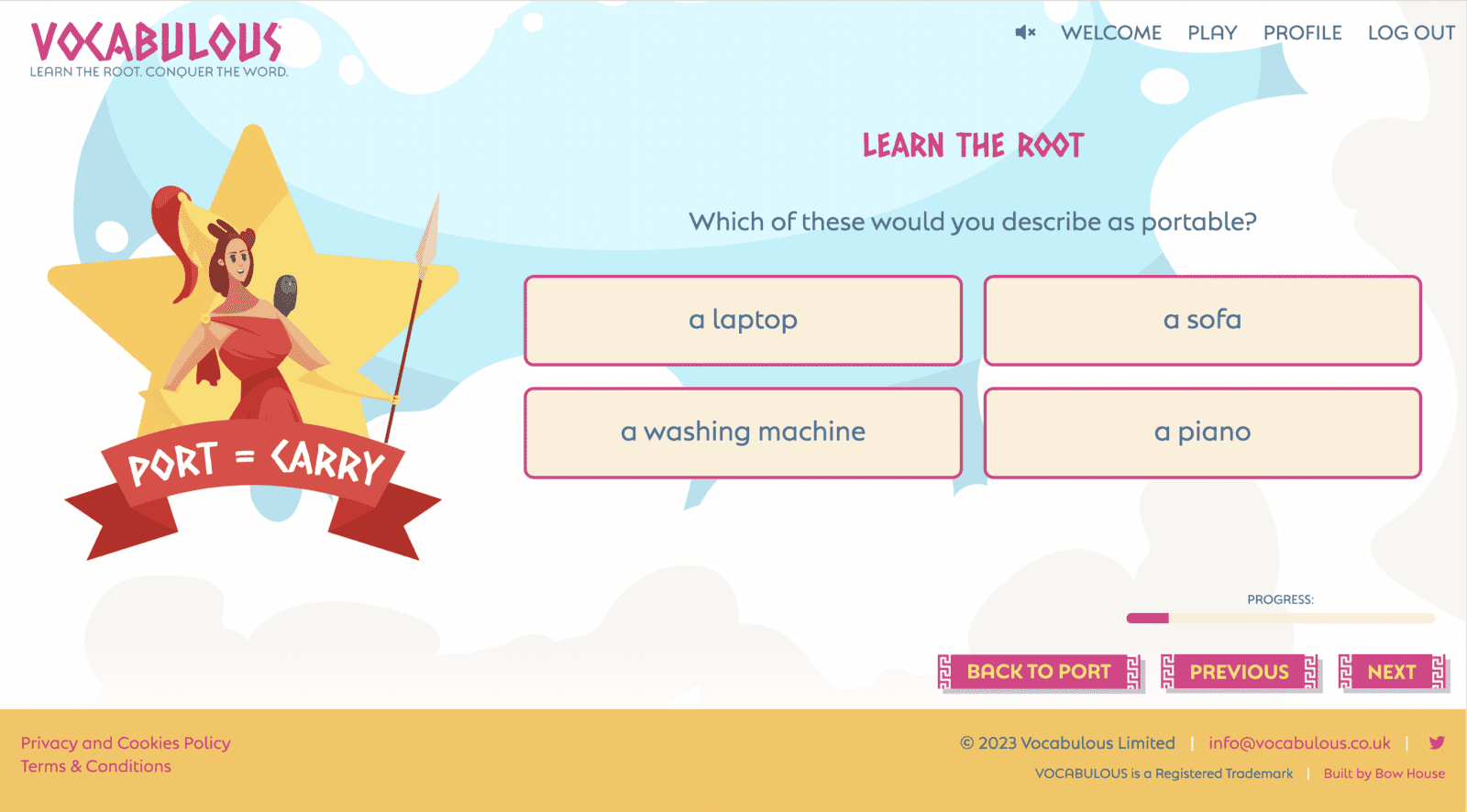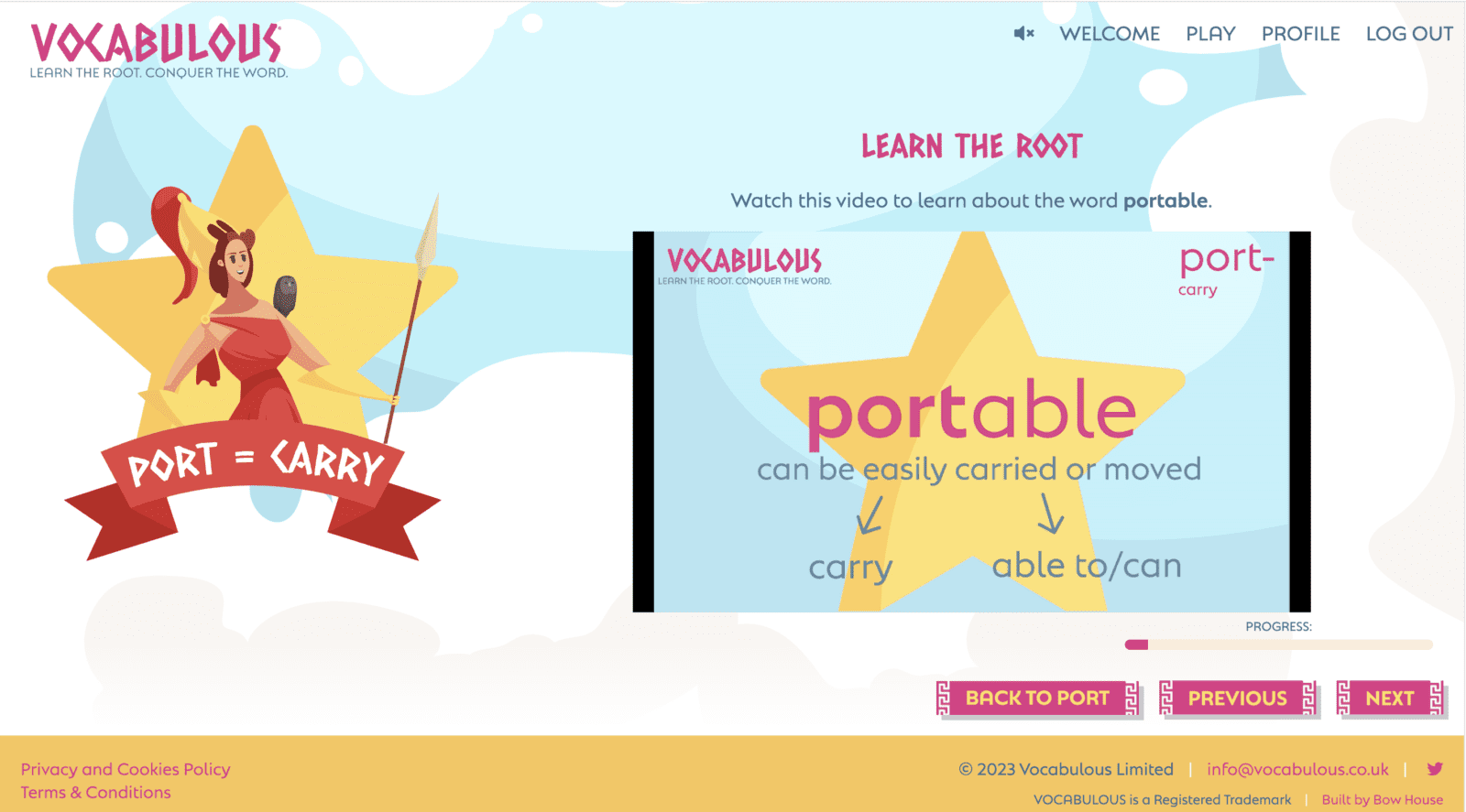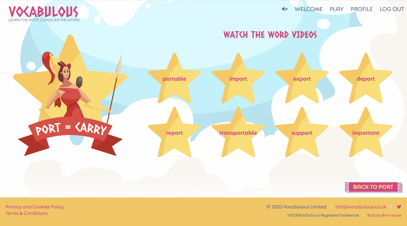 Vocabulous uses Latin and Greek root words to teach word patterns. Students then use these patterns to work out the meaning of unknown words which share the same root.